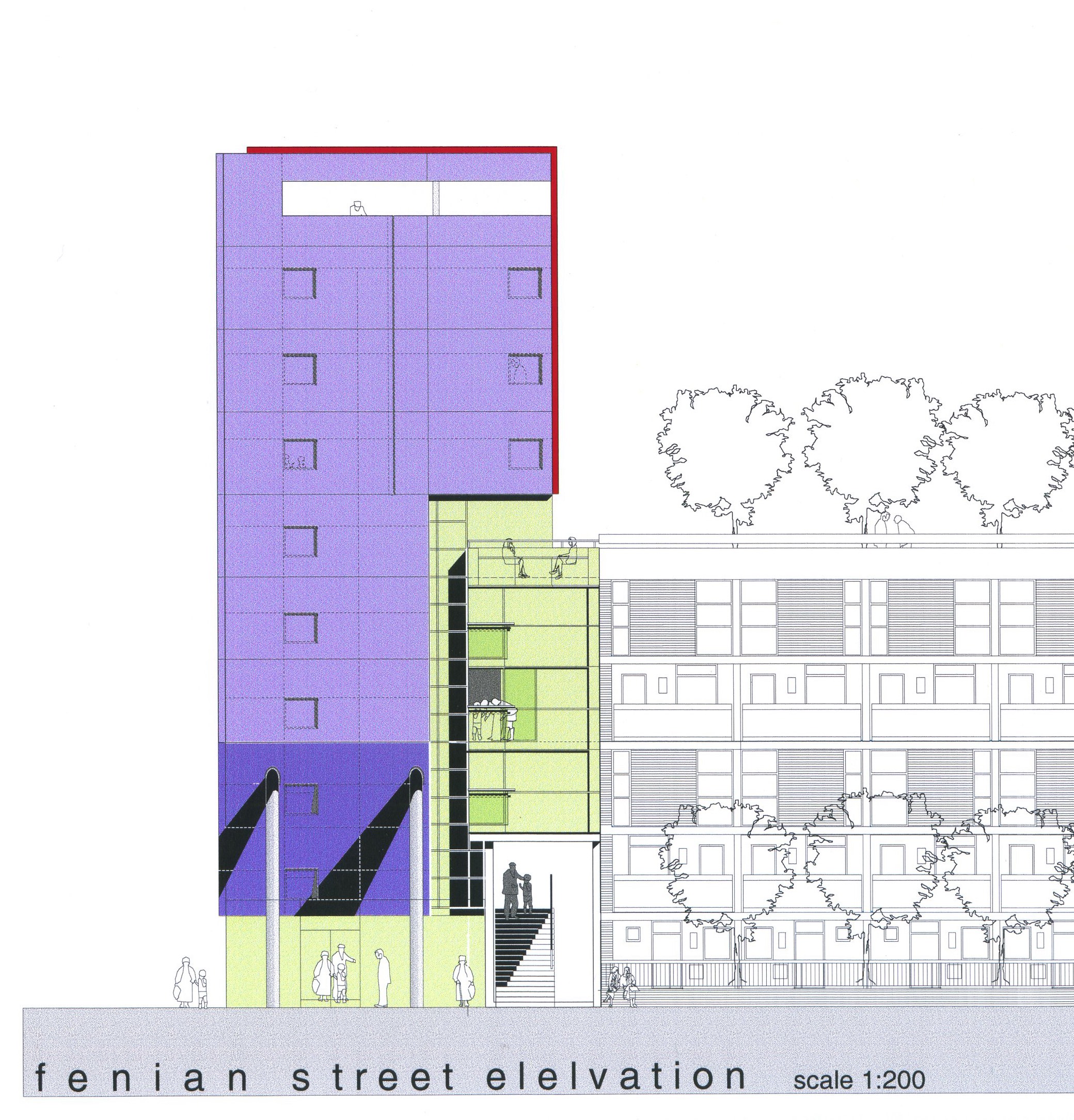 The design introduces an emblematic tower block element that rises from the corner of the site, acting as a visual marker and gateway within the neighbourhood. Modest in height yet distinctive in form, the tower provides a sense of identity and civic presence, connecting the existing social housing schemes to either side, reinforcing the importance of the site within its urban context. Its vertical emphasis is balanced by carefully articulated façades, generous glazing, and durable materials that respond to Dublin’s character while projecting a contemporary expression.