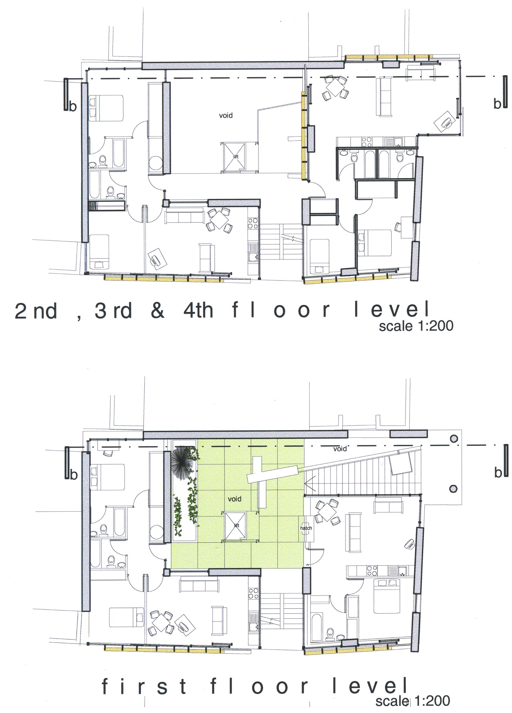 At ground and basement levels, a retail unit activates the street frontage, encouraging footfall and supporting local enterprise. Above, the residential accommodation comprises 11 two-bedroom apartments and 3 one-bedroom units, designed to maximise natural light, cross-ventilation, and efficient layouts. Homes are arranged to foster both privacy and neighbourly interaction, with shared circulation spaces that feel open and welcoming rather than enclosed and anonymous.