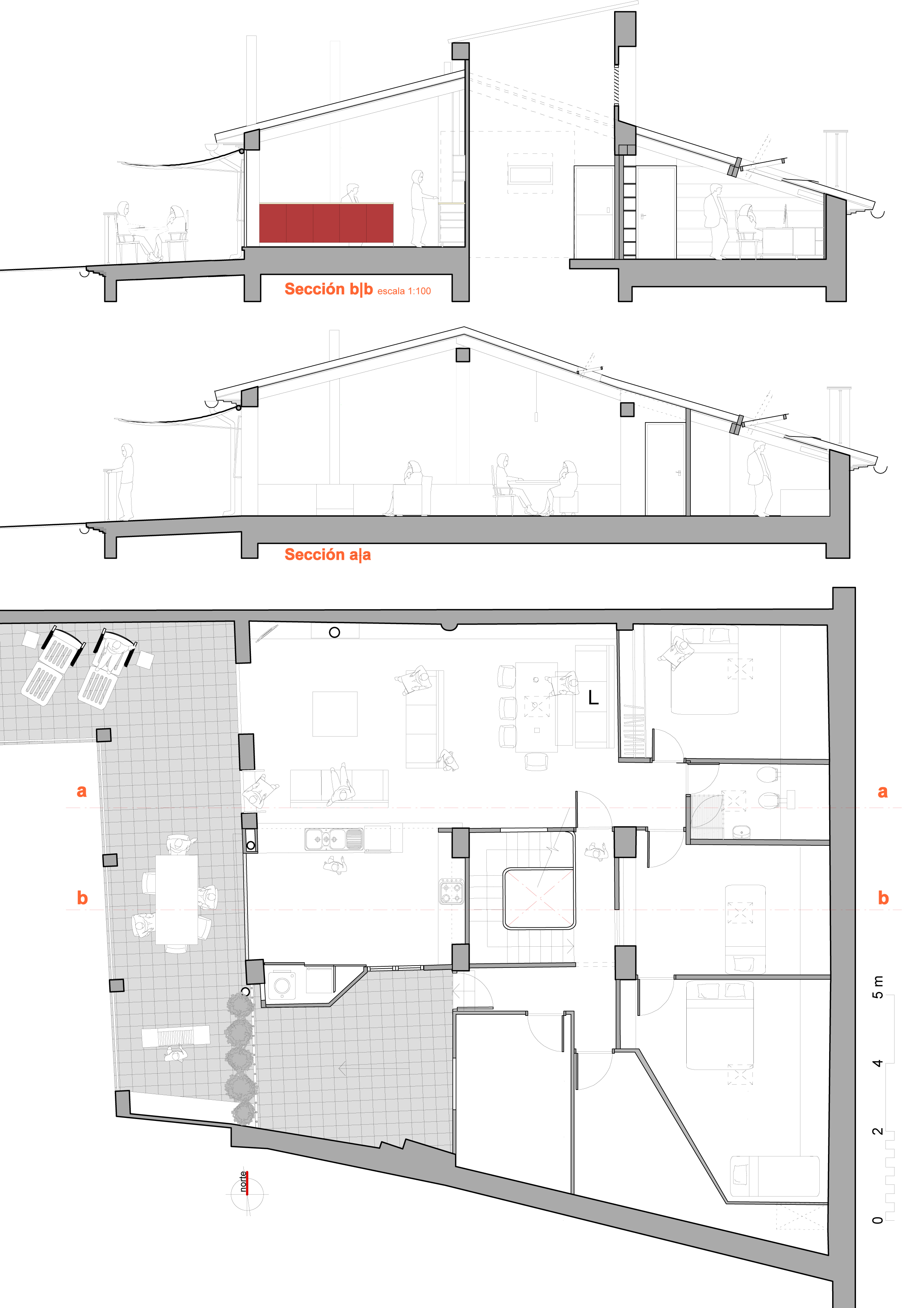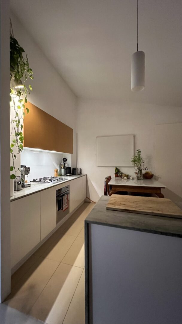 Living Spaces: The living area is designed as an open-plan layout, combining the kitchen, dining, and lounge areas. A large sliding door offers flexibility, allowing the kitchen to be fully integrated with the living/dining room or separated when desired. Both the kitchen and living spaces open directly onto a newly created roof terrace, providing outdoor extension and natural light.