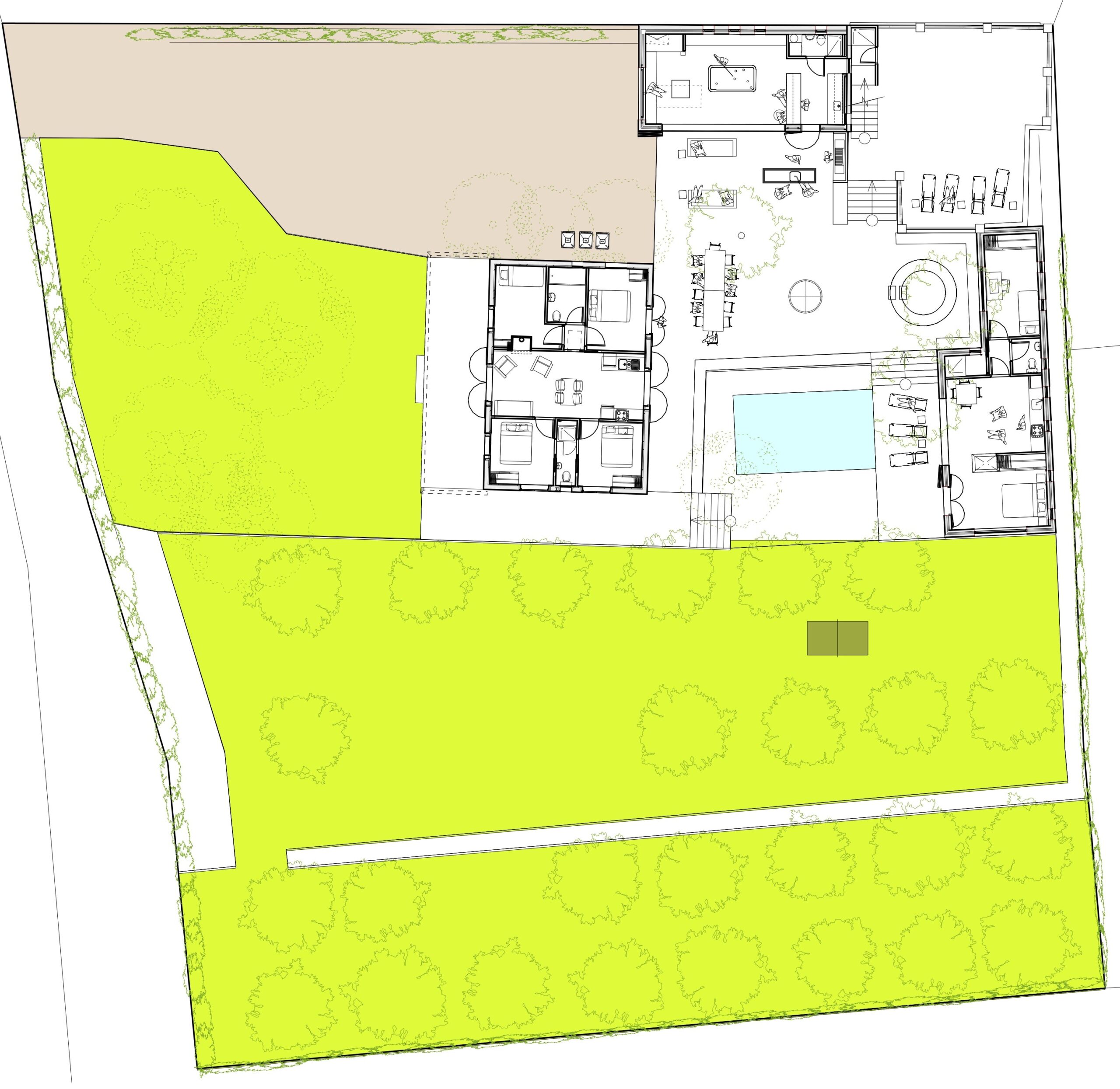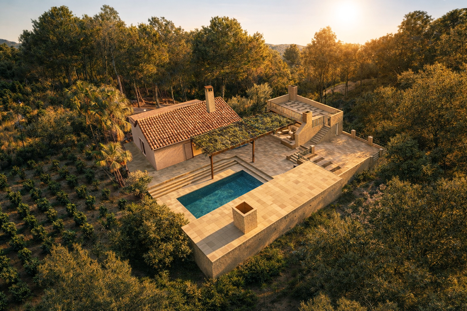 Set within a quiet pine forest on the outskirts of Valencia, this simple villa is conceived as a relaxed Mediterranean retreat that balances traditional form with contemporary living. The architecture is deliberately restrained: a compact composition organized around a central terrace that acts as the social heart of the house, connecting the main living spaces to a games room and a self-contained guest apartment. From here, the house opens out to a swimming pool framed by an orange and olive grove, grounding the project firmly in its local landscape.