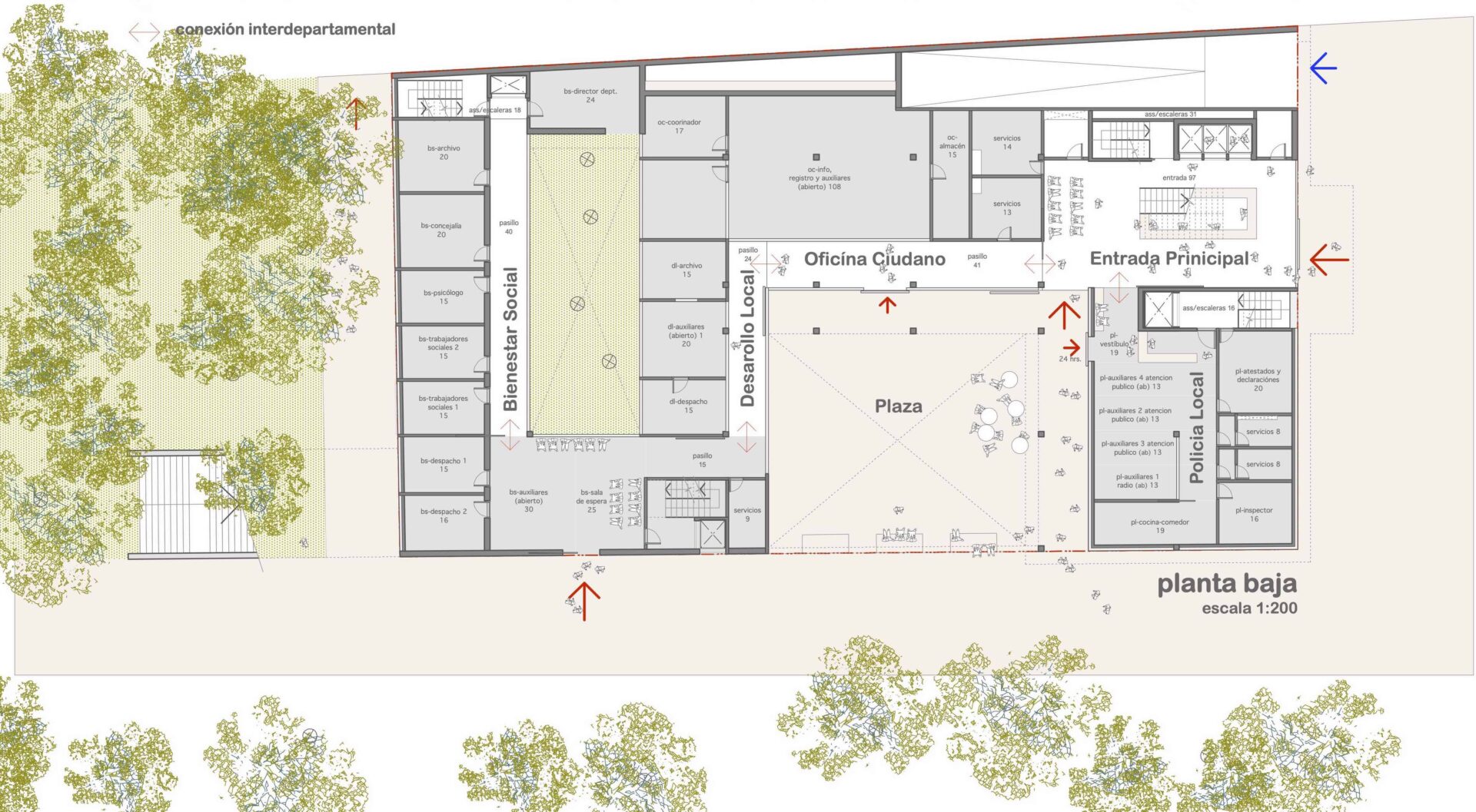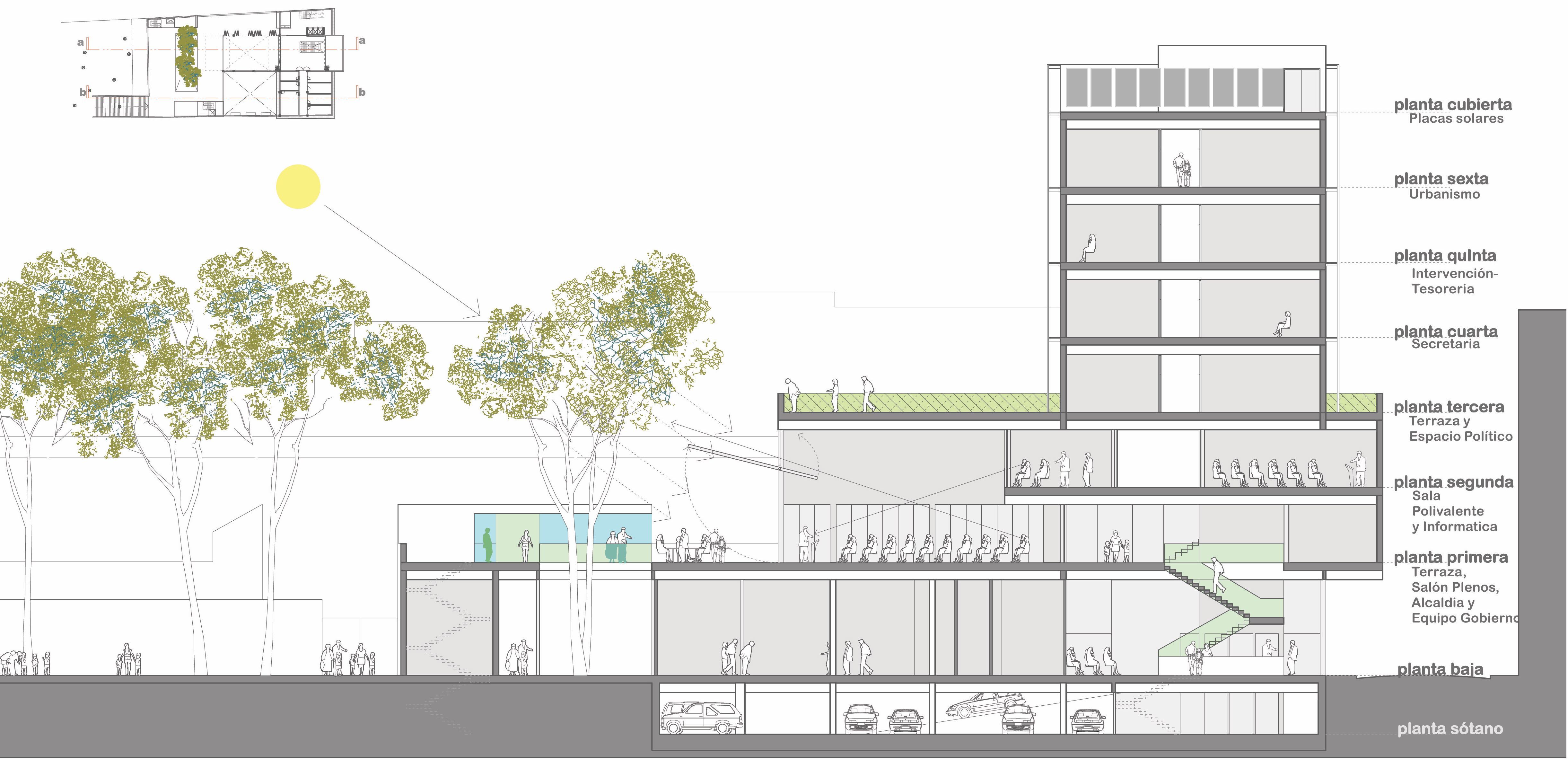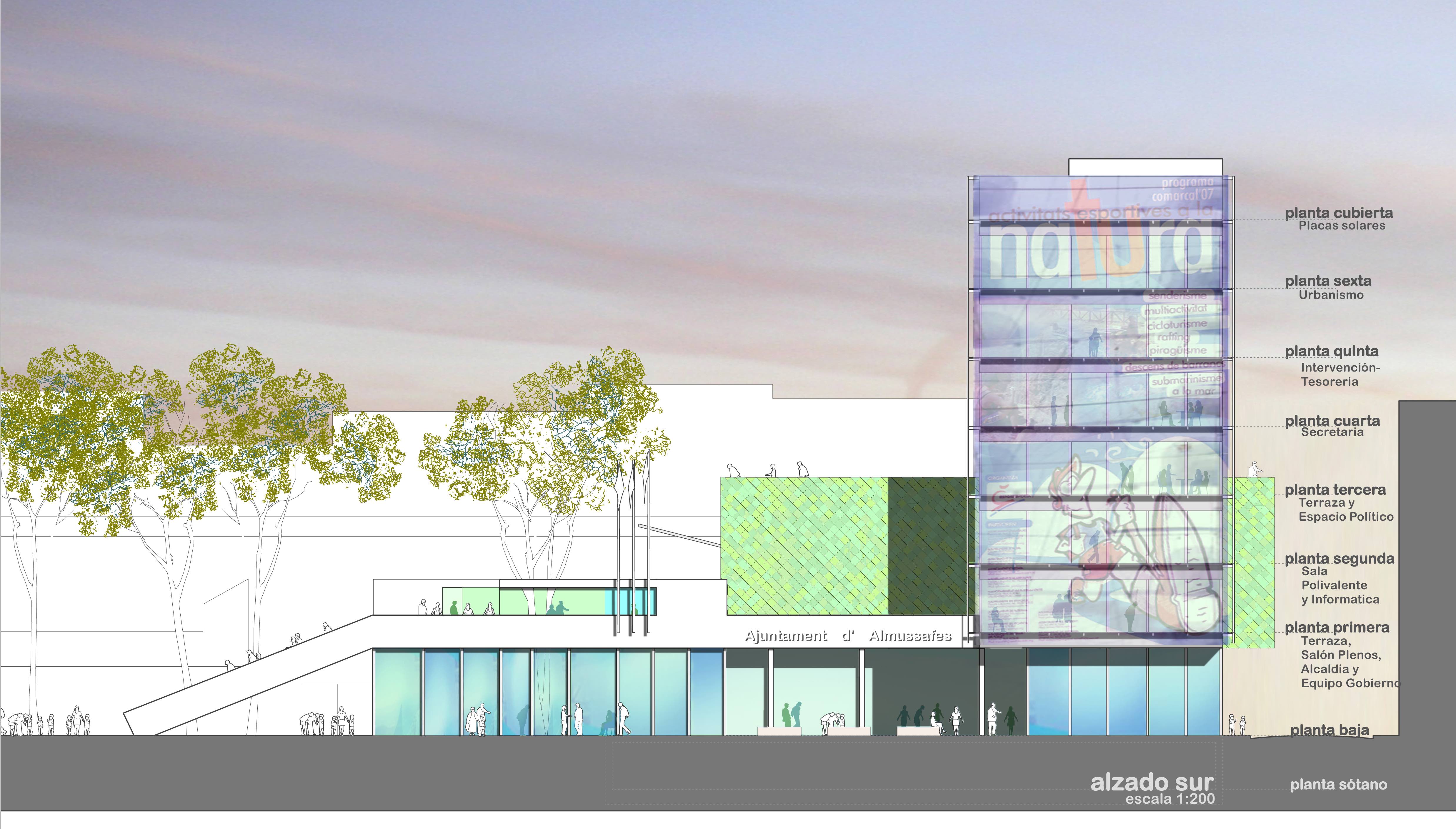 Project type: The site, located within the central park of Almussafes, is set amongst mature pine trees, and great care was taken to integrate these natural elements into the overall design philosophy. Conceived as a competition entry for the new Town Hall, the proposal sought to express civic identity while preserving the character of the park. The building footprint was carefully arranged to protect existing trees, allowing the architecture to sit lightly within the landscape. Generous glazing and shaded external circulation create a continuous dialogue between interior spaces and the surrounding greenery.